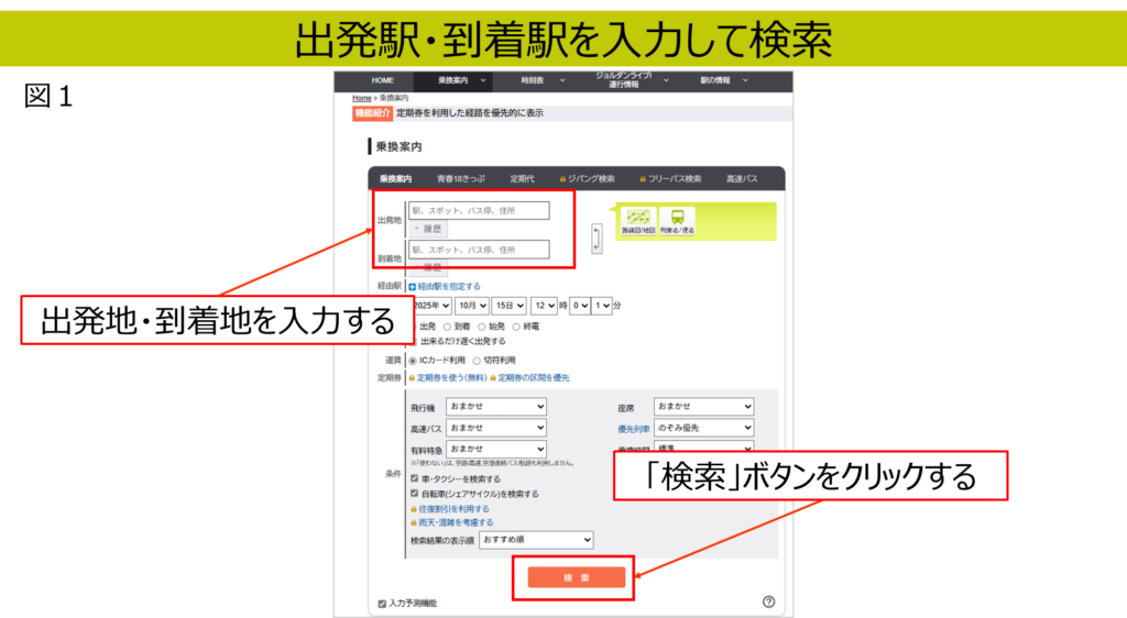 3.「到着駅」に「渋谷」と入力する。(図1参照)