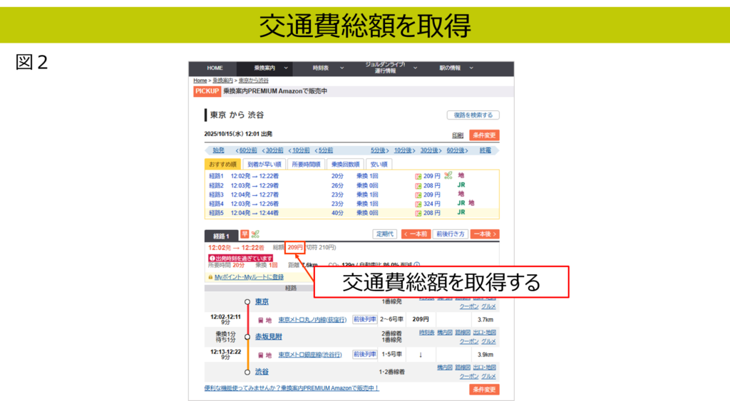 路線検索サイトで、交通費を検索し、表示された検索結果を取得します。